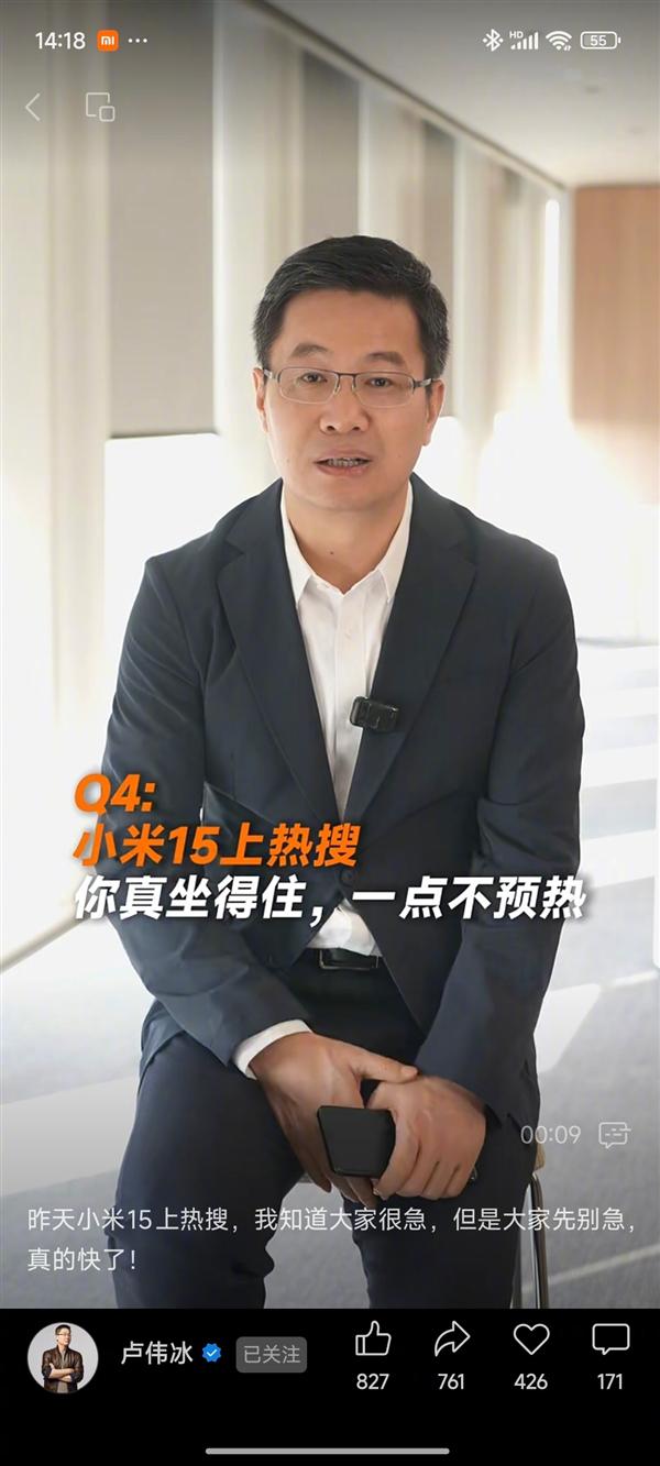 小米15成热搜焦点 米粉问卢伟冰:你真的能坐下吗?
