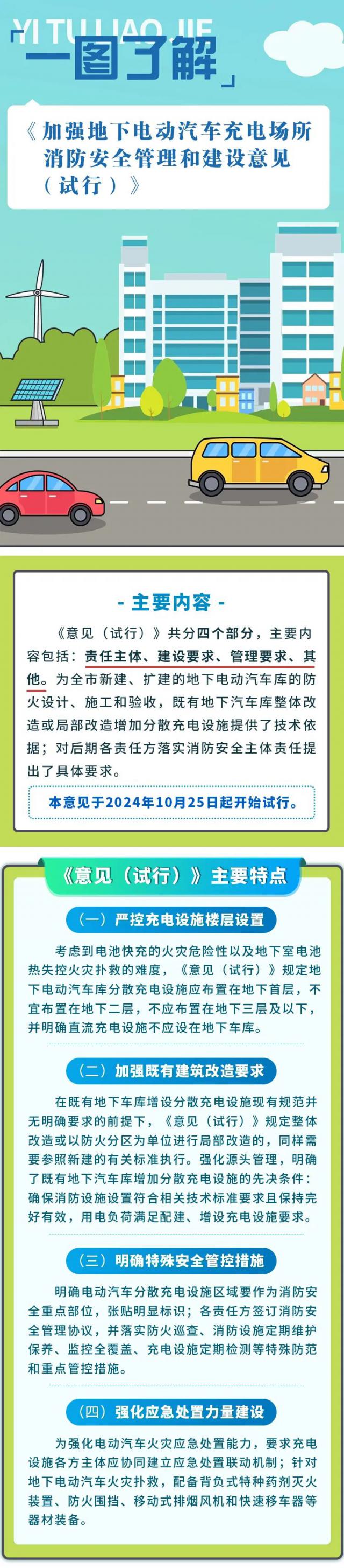 现代快报记者注意到,《意见(试行)》分为四个部分,包括责任主体、建设要求、管理规范等。,为地下电动车库的防火设计、施工和验收提供了技术依据,包括全市新建和扩建的地下电动车库。地下车库整体改造或局部改造增加了分散充电设施;对后期各责任方落实消防安全主体责任提出了具体要求。