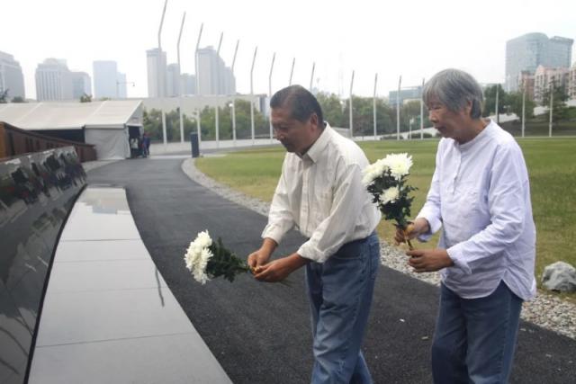 △后人向刻有乐的黑色花岗岩鞠躬,献花,献花。