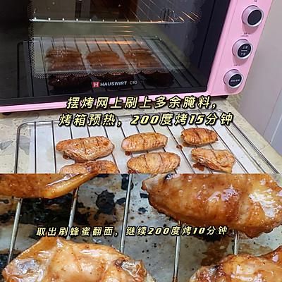 2、烘烤:腌制好的鸡翅放在烤网上,刷上多余的腌料,海氏 C40 烤箱预热,200 度烤 15 分钟,取出刷蜂蜜,翻面继续刷蜂蜜。 200 度烤 10 分钟即可。