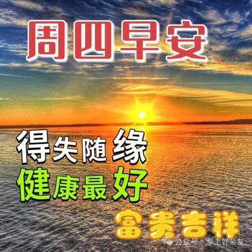 早晨的黎明出现了,幸福就在你身边。中午,阳光明媚,微笑在你心中。傍晚,夕阳西山,幸福随你一天。愿你身边平安,快乐与你同行,好运与你同在。星期四早上好,亲朋好友!