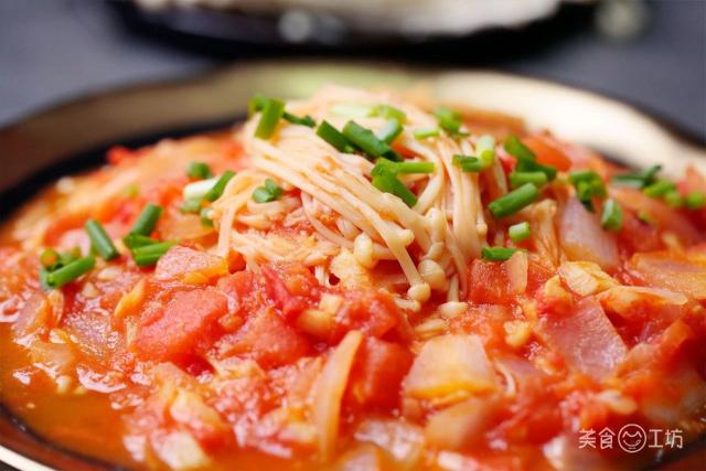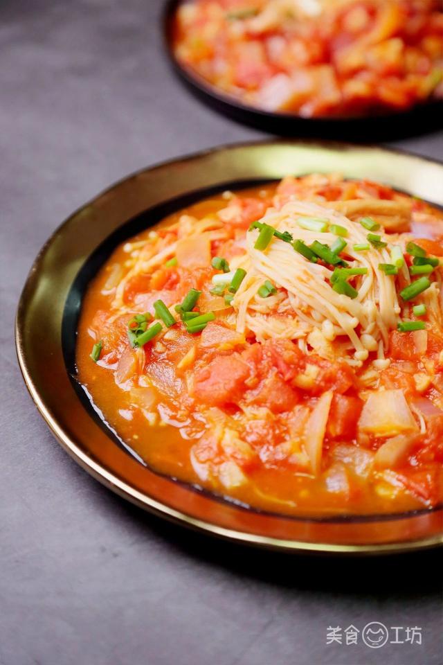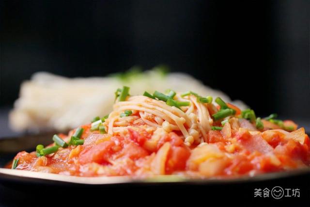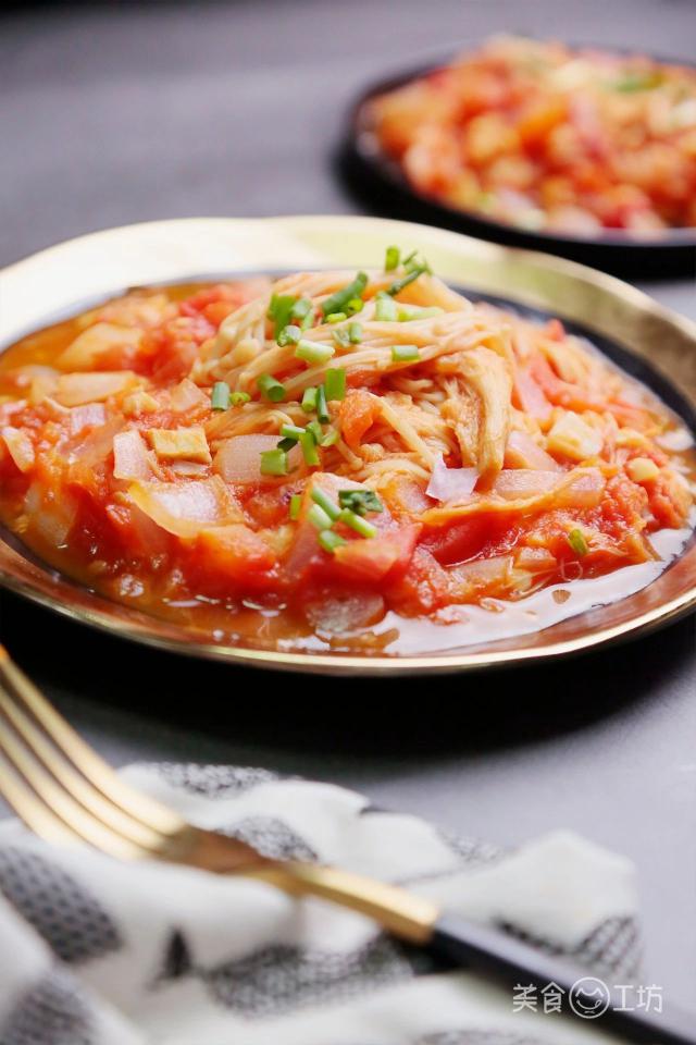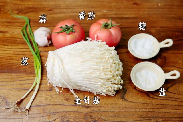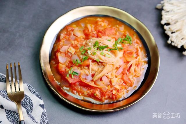 西红柿酸甜可口,口感清新;金针菇味道鲜美,纤维丰富。两种食材营养丰富,搭配起来清新爽口,非常油腻。