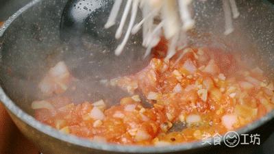 鲜红茄汁颜色诱人,金针菇吸收了足够的酸甜汤汁,口感极佳!吃完金针菇剩下的汤汁还可以拌饭。