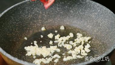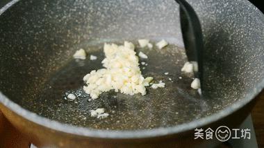 2. 锅内滚油,放入蒜末炒出香味。(如果不喜欢蒜味,这一步可以省略)