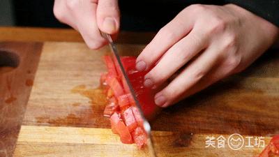 3. 放入番茄丁炒匀,盖上,中火炖煮。 8 分钟。