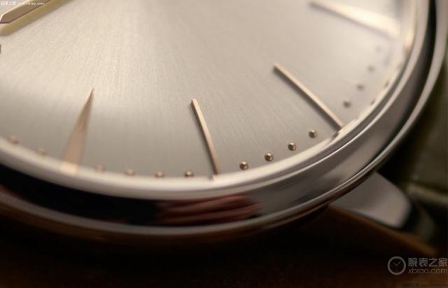 首先,我非常喜欢它的古银色表盘。经过旭日缎面拉丝饰面,整个表盘有很强的复古感;即使不需要刻意找视角,也可以看到表盘是从四周向中心隆起的,形成了明显的深度效果,层次感更强。
