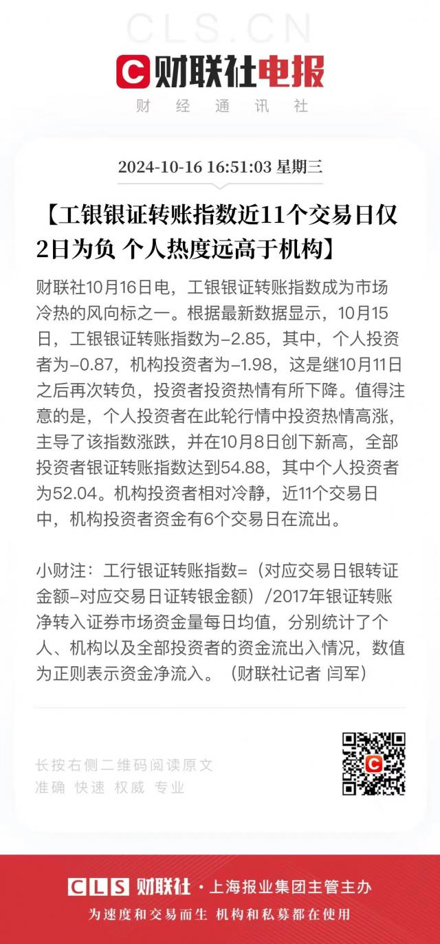 据最新数据显示,10 月 15 当天,工银证转账指数为 -2.85,其中,个人投资者是 -机构投资者为0.87 -1.98,这是继 10 月 11 日后再次转负,投资者投资热情明显下降。。值得注意的是,在这一轮行情中,个人投资者的投资情绪高涨,主导了指数的涨跌。,并在 10 月 8 日创新高,全体投资者银证转账指数达到新高。 个人投资者为54.88 52.04。机构投资者比较理性,接近 11 在一个交易日内,机构投资者有资金 6 一个交易日正在流出。
