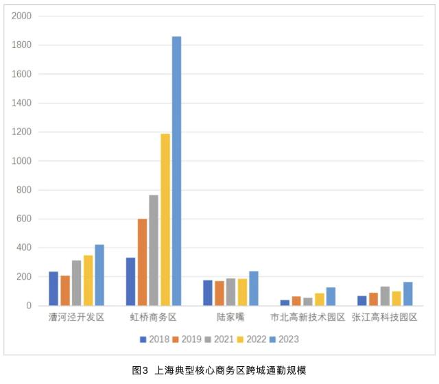 从 2018 年 -2023 2008年,上海五大新城流入流出通勤总量。 1.3 万人上升至 3 一万多人,而新城嘉定、青浦、松江三大临界城市