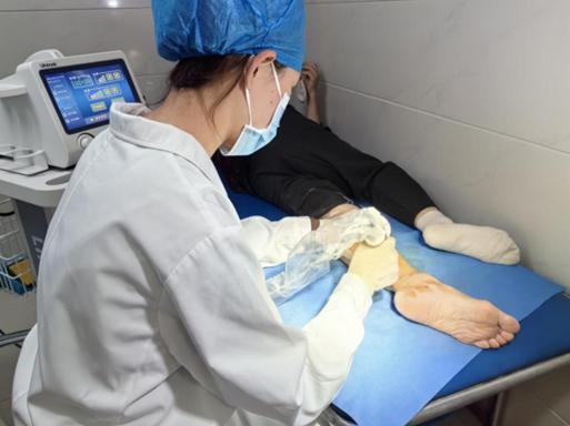 因为奶奶皮肤脆弱,血运不好,不能定期结痂,伤口被厚厚的痂皮包裹着。陈瑶护士用超声波清创仪耐心细致地将奶奶小腿上堆积的痂皮一层一层剥离。经过半小时的处理,粘在伤口上的痂被清洗干净,埋藏多年的伤口露出,然后进行消毒,使用新敷料。治疗结束后,阿婆感激地说:“辛苦你了,给我解决了这么大的困惑,以后我会准时来换药,虽然路途遥远。”“简单的话语,却充满了对五里医护人员的信任。