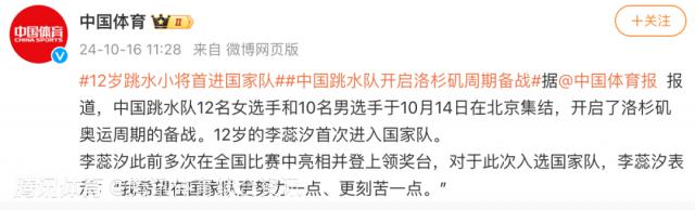 北京时间 10 月 16 据中国体育报报道,日日,中国跳水队 12 名女选手和 10 名男选手于 10 月 14 日本聚集在北京,开启了洛杉矶奥运会周期,12 年李蕊汐首次进入国家队。