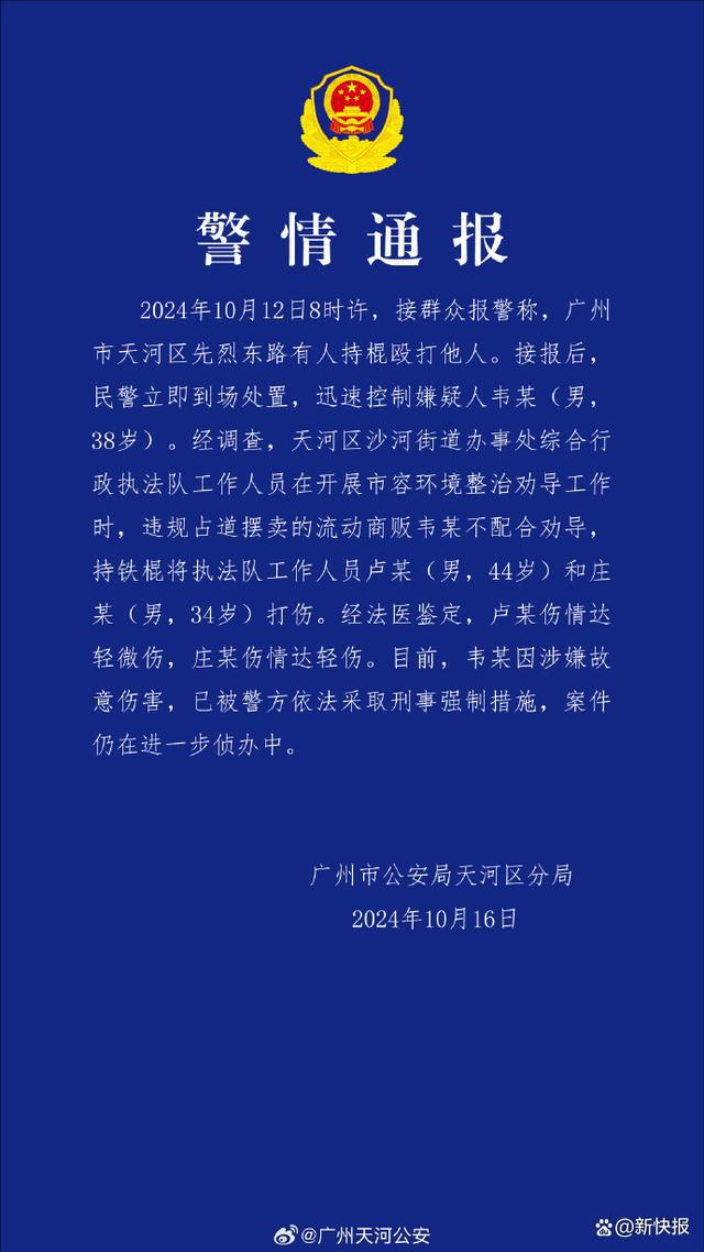 10 月 16 当天晚上,广州市公安局天河区分局发布了一份警告报告:10 月 12 日 8 时许,接到群众报警称,广州市天河区先烈东路有人用棍子殴打他人。