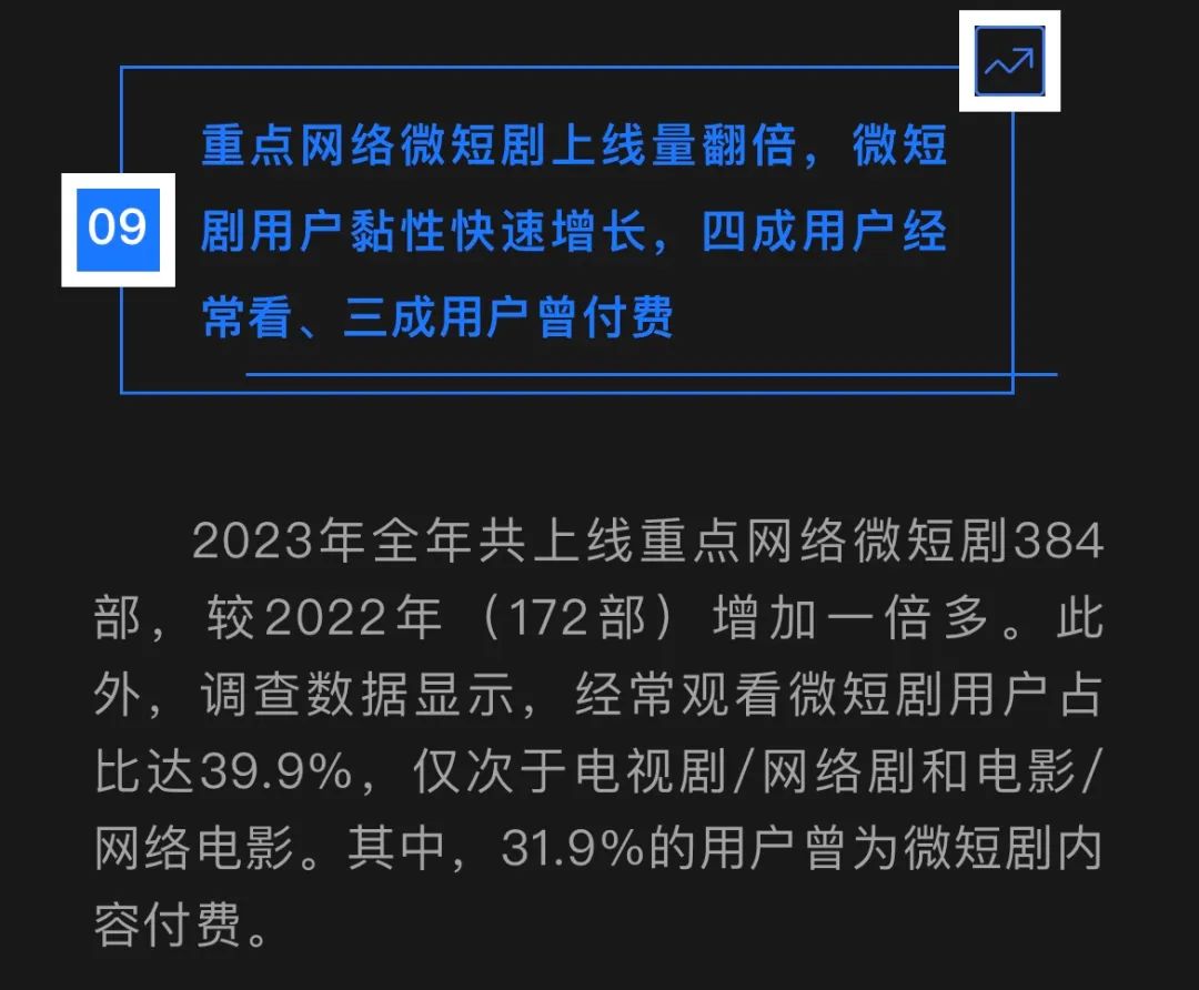 根据《中国网络视听发展研究报告(2024)》,2023年共推出384部重点网络短剧,比2022年(172部)翻了一番多。