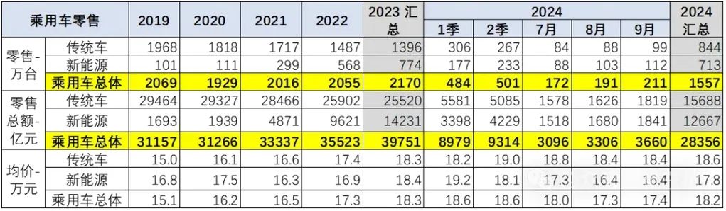近日,乘联会崔东树发布了9月份乘用车价格段市场结构分析。资料显示,2019年平均车价为15.1万元,2020年为16.2万元,2021年为16.5万元,2022年为17.3万元,2023年为18.3万元,今年累计下降至18.2万元。