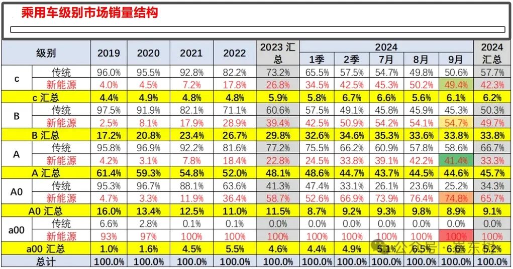 在这个价格上,即汽车在新能源汽车中的渗透率达到了前所未有的高度。具体来说,9月份微型车的新能源渗透率居然达到了惊人的100%。与此同时,A0级小型车的新能源渗透率也超过了75%。此外,A级车型在新能源方面的提升也不容小觑,增速也相当可观。