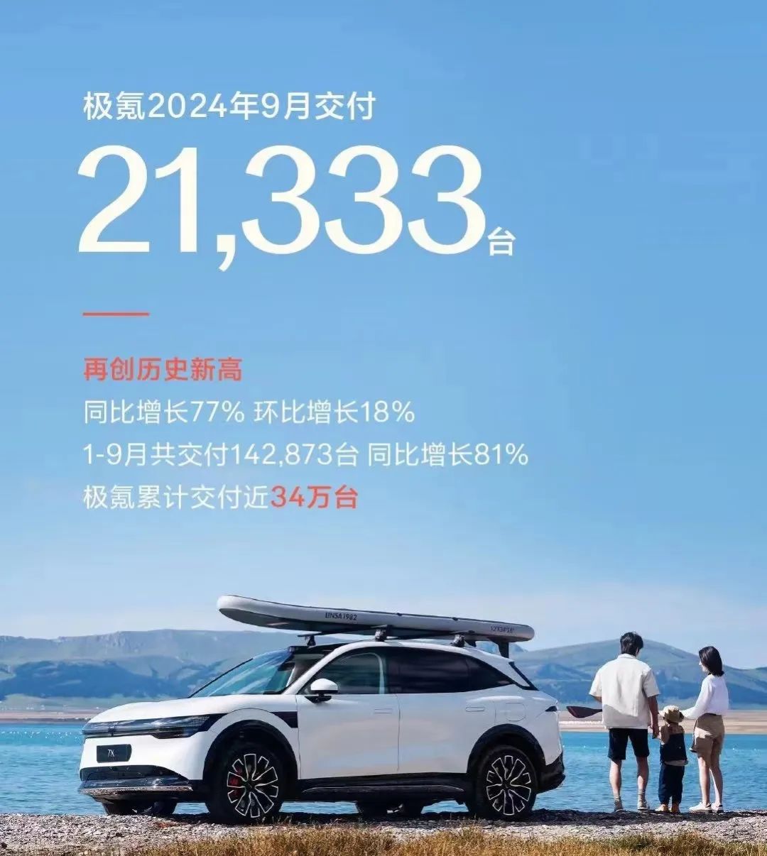 而且在过去的9月份,极氪交付了21333辆新车,比去年同期增长了77%,比去年同期增长了18%,累计销售额接近34万辆。