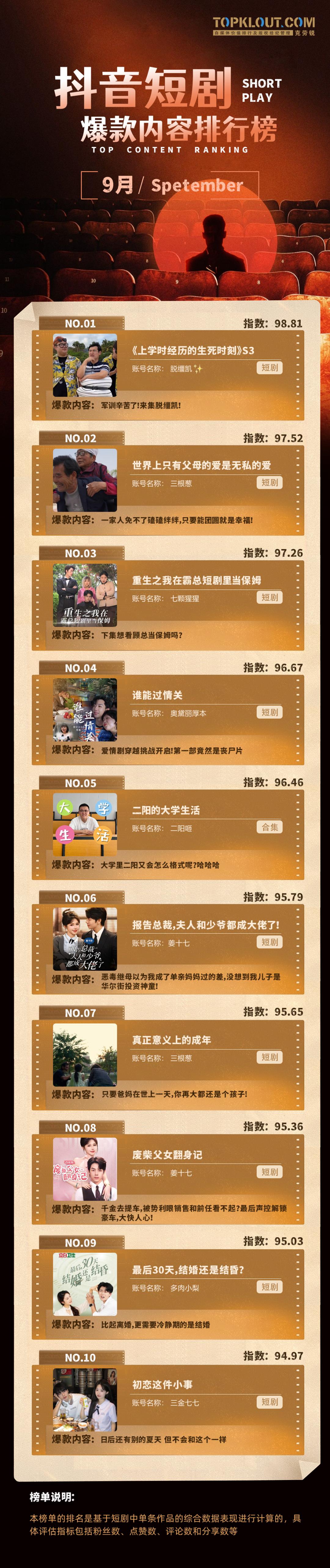 在过去的两个月里,观众指向中老年人群体的短剧一度占据了各平台的短剧榜单,播放量 稳步攀升,成为短剧赛道上的黑马。例如,在9月克劳锐的《颤音短剧爆炸内容排行榜》中,面部中老年人的短剧《世界上只有父母的爱是无私的爱》排名第二,超越了一批著名作品。