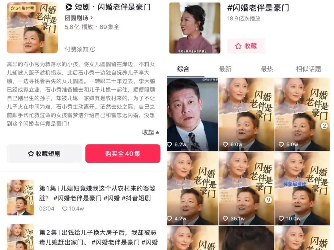 剧情上,《闪婚妻子是富裕家庭》类似于最早出圈的中老年短剧《闪婚五十岁》。《闪婚五十岁》讲述了一个面临中年危机的离婚女性在相亲中偶然遇到隐藏身份的“冷酷总裁”,结婚领证。婚后,她经历了一系列冲突事件,如孩子叛逆、婆媳矛盾、认亲等。,最终迎来了第二次重逢。目前,这部作品在颤音的话题已经超过23亿。
