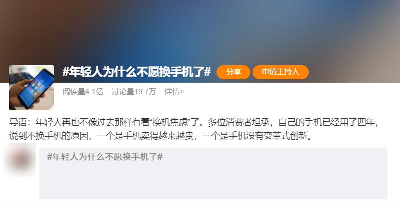 微博也曾经有一条热搜#为什么年轻人不愿意换手机#,一度造就了# 4.1 十亿的阅读量, 19.7 万的讨论,话题下面挤满了四五年没换机的网友。