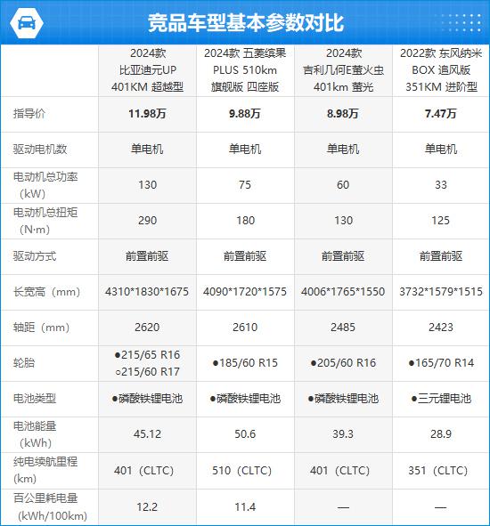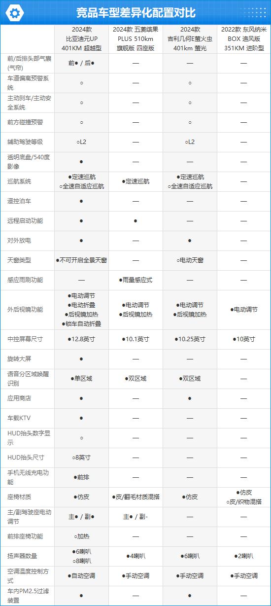 和同属于纯电小型 SUV 的五菱缤果 PLUS、吉利几何 E 东风纳米中的萤火虫 BOX 进行比较,2024 款比亚迪元 UP 不但车身长度全面占优,整体装备水平也明显高于竞品车型。包含前 / 后排头部气囊 ( 气帘 ) 、透明底盘 /540 程度图像,遥控泊车,车载 KTV、前排手机的无线充电功能,自动空调等都是独家配备。此外,2024 款比亚迪元 UP 虽然它在电机性能参数方面也表现出色,但它的性能参数 CLTC 纯电续航里程落后于五菱缤果。 PLUS。