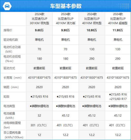 2024 款比亚迪元 UP 整个系统配备外置单电机和磷酸铁锂电池,提供两个续航版本。其中,入门级车型 CLTC 纯电续航里程为 其它车型301km CLTC 达到纯电续航里程 401km。在配置方面,整个车型都配备了 DiLink 智能网络连接系统,内置大量应用,并标配 4G 网络,支持 OTA 升级和 Wi-Fi 热点等功能。除了整体设备水平较高外,顶配车型还提供了大量的选配设备,包括 L2 级辅助驾驶,8 英尺 HUD 数字显示,前排座椅加热,PM2.5 绿净™智能空气质量优化系统,17 英尺灵动炫风铝合金轮毂等,消费者可根据需要选择。