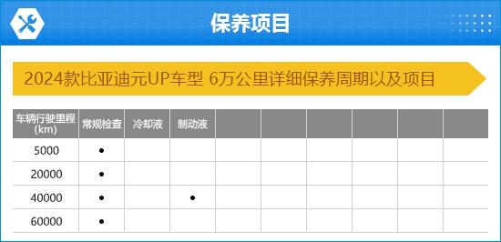 按照维修手册,2024 款比亚迪元 UP 整车质保为六年或六年。 15 万公里(以先到为准)。首次 3 个月或 5000 第一次公里检查车辆,包括制动系统、轮胎、线路、电驱动系统、动力电池等。后续每一次。 12 个月或 20000 定期检查公里。在这些冷冻液中,永磁电机 4 年或 100000 需要更换公里,而刹车油则是每行驶一次。 2 年或 40000 每公里更换一次。