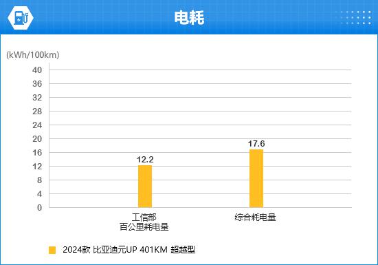 根据工业和信息化部的申报信息和各大汽车垂直媒体的测试数据,2024 款比亚迪元 UP 401KM 超越型工业和信息化部用电量为 12.2kWh/100km,懂车帝实测综合用电量为: 17.6kWh/100公里。(数据仅供参考)
