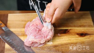1. 用剪刀把鸡腿沿骨头剪开,用刀把肉刮掉(用剪刀把连接处)。