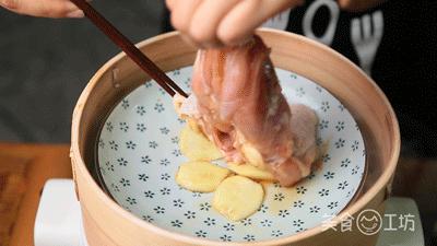 3. 将姜片放在盘底垫上,放入鸡腿肉中,锅内开水后放入蒸熟。