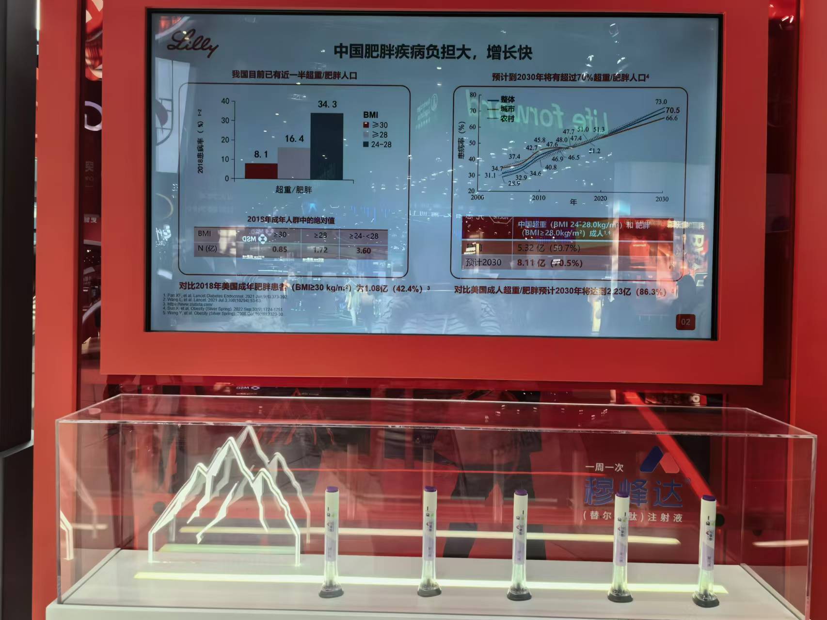 今年9月,礼来在2024年中国国际服务贸易交易会上展示了替尔泊肽。在这个中国国际进口博览会的展位上,礼来展示了五支替尔泊肽的演示笔,上面的显示屏介绍了中国肥胖和礼来在心血管代谢健康领域的研发布局。