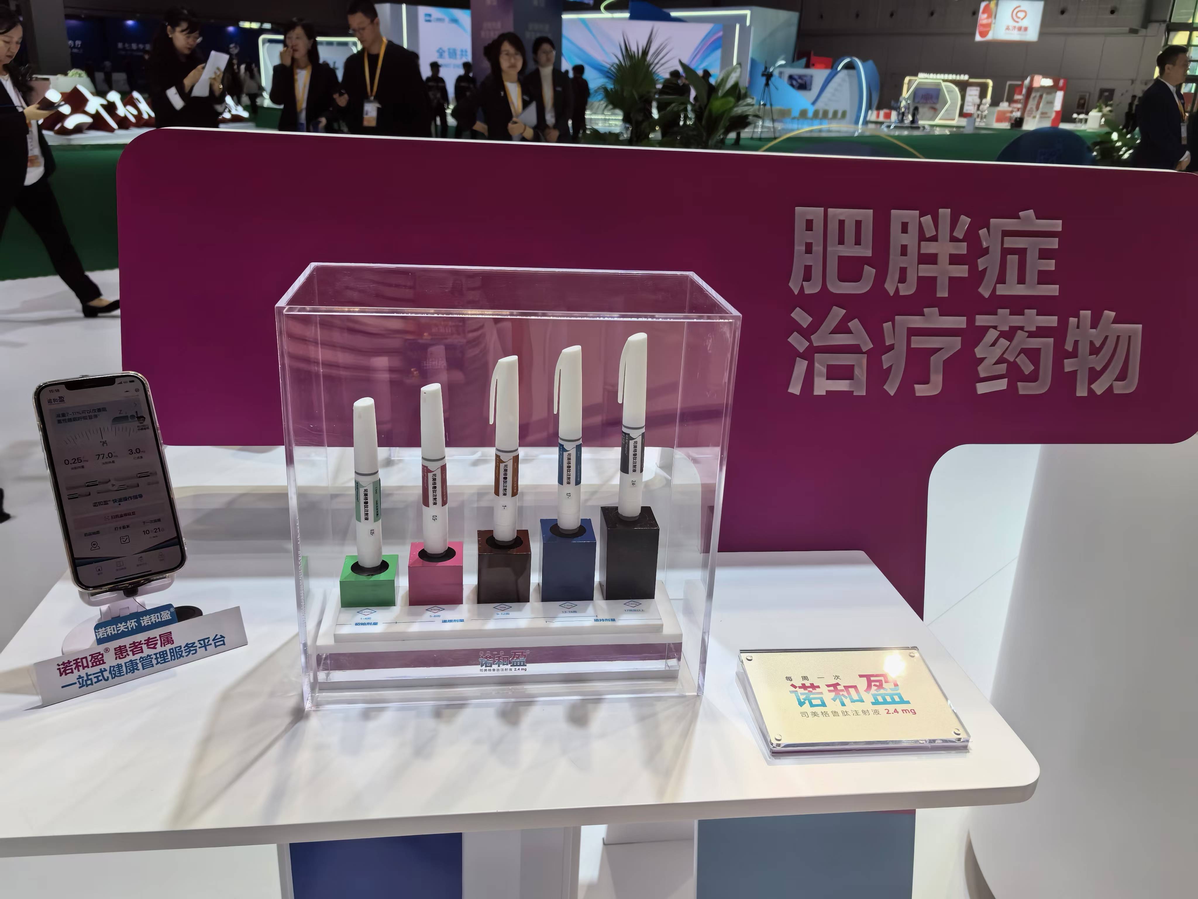 今年,来自中国国际进口博览会的诺和诺德在多种疾病领域展出了15种创新药物和5种注射设备,其中今年在中国获批的4种创新药物实现了中国第一次展出,包括世界上第一款GLP-1受体激动剂司美格鲁肽片(商品名:诺和忻)和世界上第一款用于长期体重管理的GLP-1周制剂——诺和盈,也就是长期体重管理的司美格鲁肽注射剂。