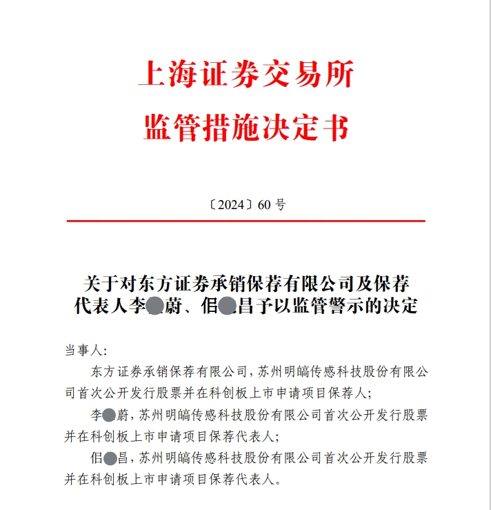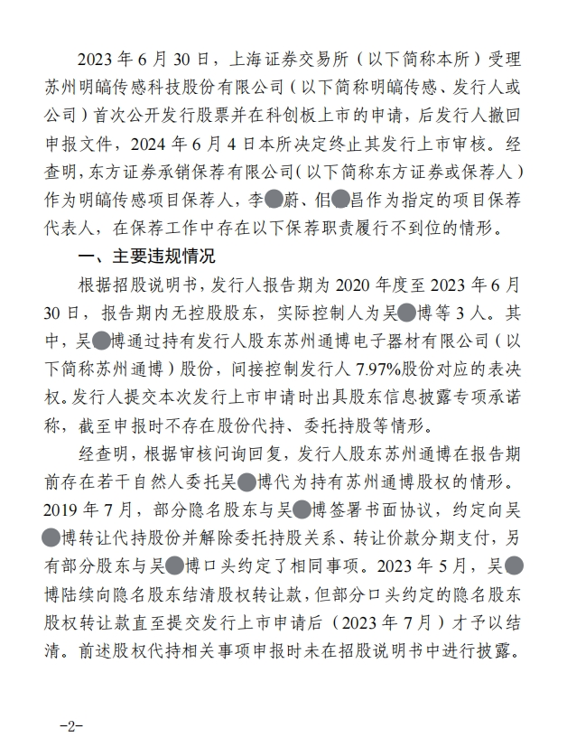经调查,东方证券承销保荐作为保荐机构,未能充分关注明传感项目股份的明确情况,认真核实报告,履行保荐职责不到位。作为项目保荐代表,李某蔚和长某昌对此负有直接责任。保荐机构和两名人员最终受到控制和警告。同时,上海证券交易所要求东方证券承销保荐进行整改和内部责任追究,并向上海证券交易所提交书面整改报告。