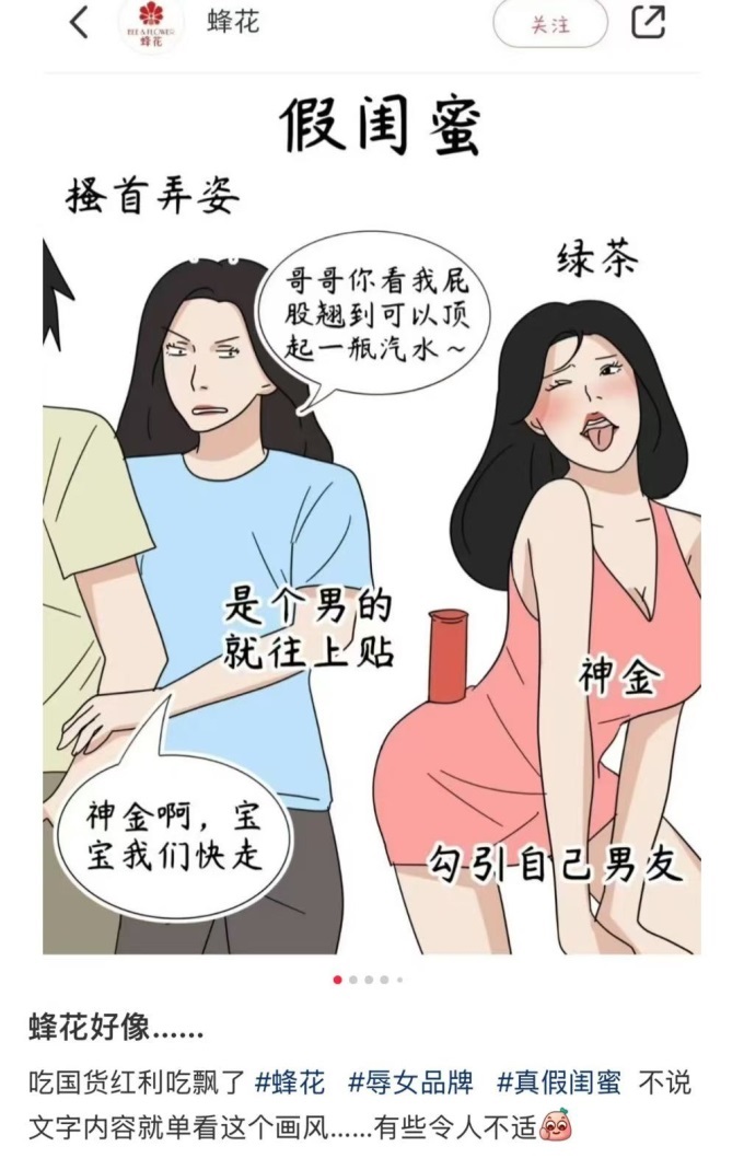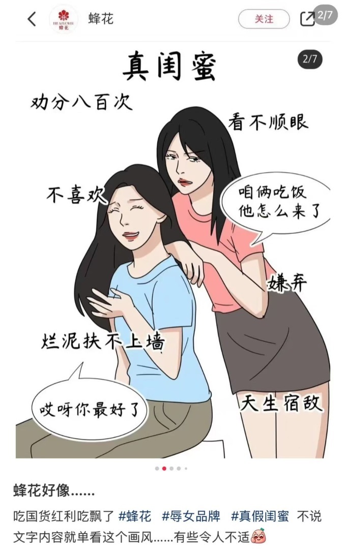 事件原因是蜂花在官方小红书账号转载了一部漫画《看清楚什么是真假闺蜜》,其中漫画中的文字引起了网友的热烈讨论和冲突。