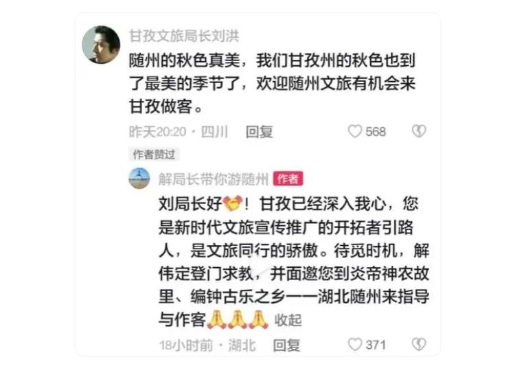 随后,刘洪通过留言发出邀请:随州的秋色真的很美,我们甘孜州的秋色也是最美的季节。欢迎随州文化旅游有机会参观甘孜。