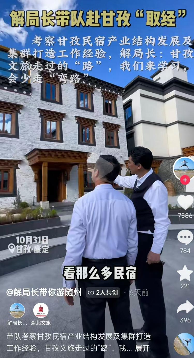 近日,湖北随州文化旅游局局长解伟、四川甘孜文化旅游局局长刘洪两位互相邀请两年多的网友翘首以盼,最终在甘孜见面。解主任(指解伟,网友习惯称其解主任,同样)也兑现了两年前刚走红时许下的承诺:去甘孜向刘洪“上门请教”。根据官方信息,上游新闻了解到,这次解厅长领导去甘孜,主要是想考察一下甘孜文旅在民宿产业发展方面的经验。两位以武侠风格出圈的文化旅游局长也第一次合身。他们穿着古装拍摄了武侠片《剑走天涯》(本文指的是短视频),吸引了大量粉丝的好评。