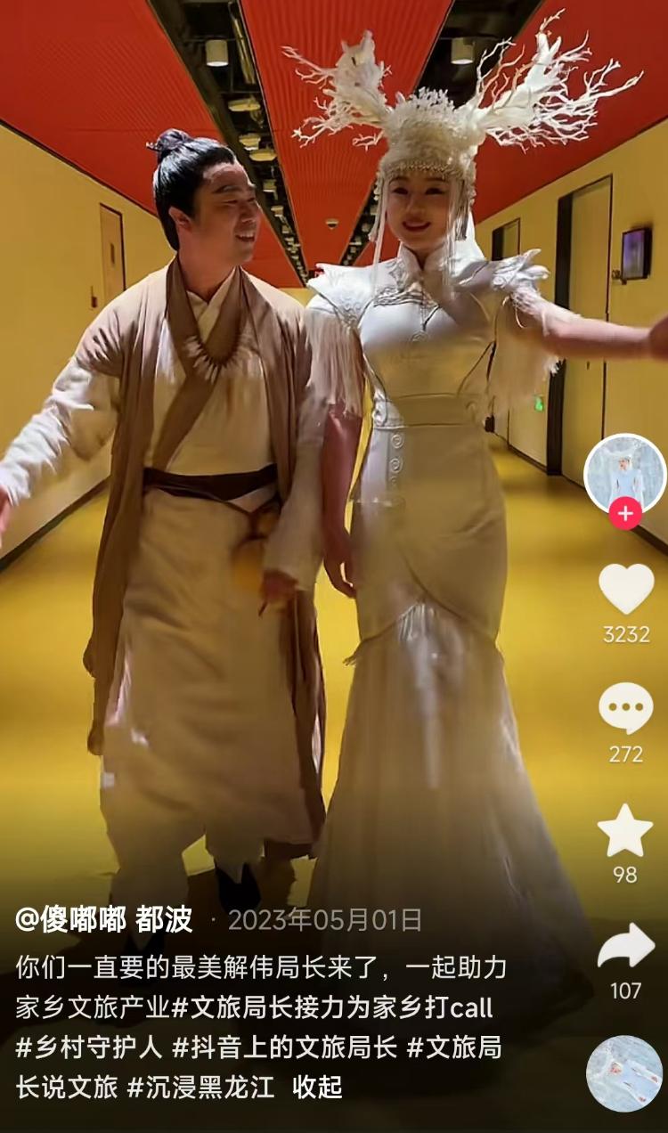 由于穿着鄂伦春族白鹿传统服饰,黑龙江省塔河县文化旅游局局长都波在白雪皑皑的森林中为当地美景代言而走红。2023年5月,都波利用自己的视频号“愚蠢” 都波发布了一段视频,视频中她与解厅长同框互动,推荐塔河文化旅游资源。录像中,都波再一次穿上了鄂伦春族白鹿的传统服饰,而解主任身着古代文人的服饰,腰上系着葫芦。随后,塔河渡口景区、冰河谷地、界河风光、鄂伦春民族乡等文化旅游资源一一闪现。