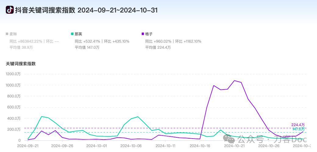 杨子和那英是两个节目中最受欢迎的明星。根据抖音算术指数,近三个月来,杨子在抖音的平均热度为224.4万,而那英的平均热度是147万,前者和后者的热度是1.52倍。