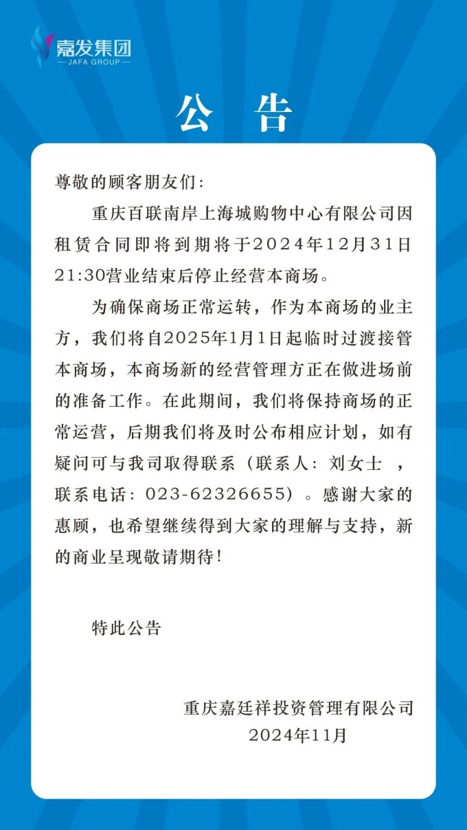 与此同时,商场的业主嘉发集团也发布了这一消息,并表示将于2025年1月1日起临时接管该商场,新的运营管理人员正在准备入场。