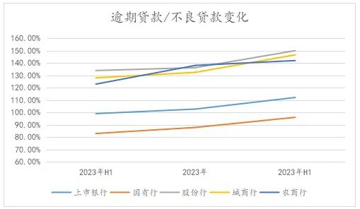 因此,逾期贷款/不良贷款的比例越小,银行对不良资产的认证就越严格,总之就越放松。由于银行第三季度报告没有披露相关指标,中期报告数据显示,上半年逾期不良贷款比例为112.13%,比例较低。 2023 年底提高 9.38 个点。