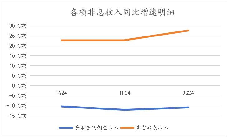 上市银行的手续费和佣金收入增长在保险、理财和基金渠道降费的大环境下并不乐观。2024年前三季度,上市银行手续费和佣金净收入同比下降10.75%。