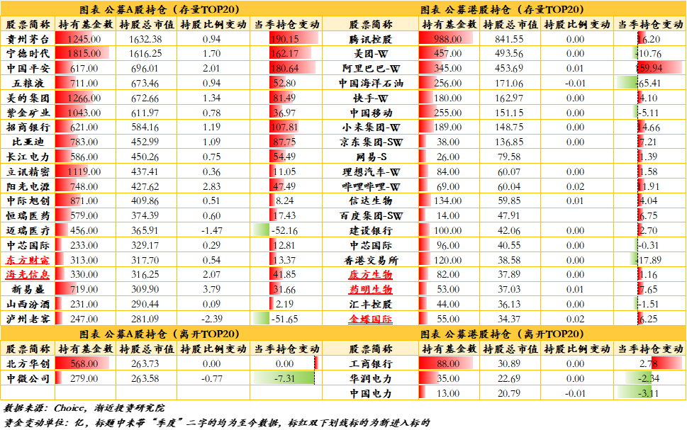 首先是公募基金的第三季度报告。公募基金a股前20名中,科技股减少,金融股增加,银行、电力、消费股在港股前20名中减少,药业、软件股增加。