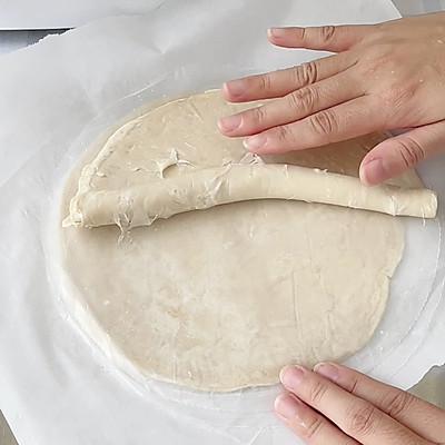 1、1. 将手抓饼稍微解冻后,每个手抓饼卷起来