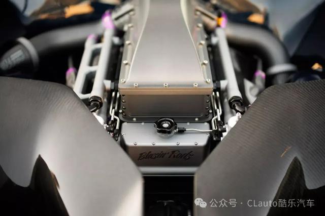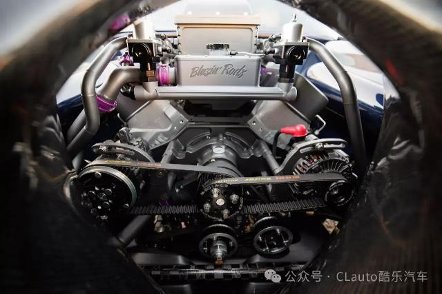接着是这辆车的核心发动机,这是一个 8.8 升的 Brodix 组合一对V8 Precision 8385 Next Gen 和双涡轮增压器 10-GPM 的 Aeromotive 燃油泵,燃油箱也与后扩散器接触固定。