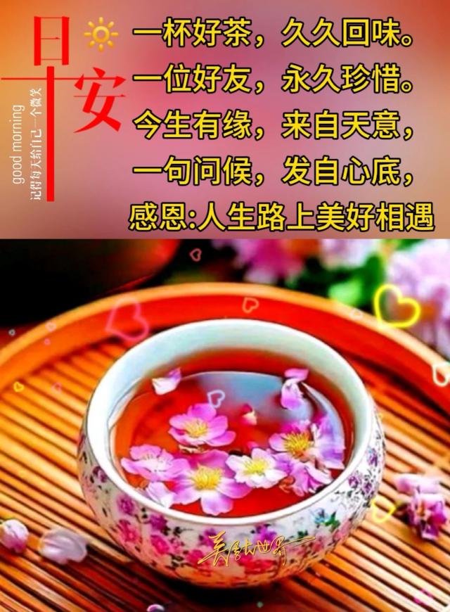 早上好!祝你新的一天心情愉快,心情愉快。友谊是生活的财富。让我们珍惜每一种真诚的情感。它们像阳光一样温暖着我们的心。愿我们的友谊长存,幸福永远伴随着我们。祝你有美好的一天!