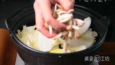 4. 将清水倒入锅中,依次放入白菜、蟹味菇、香菇和豆腐中。
