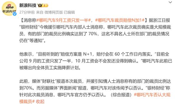九月份曝光哪吒汽车的工资只有一半 裁员赔偿N 1 官方曾辟谣