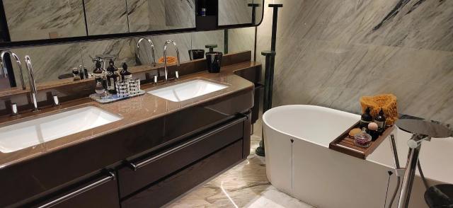 而且卫生间使用的静雅棕奢石,也是极为罕见的奢石,但这里却是全铺。