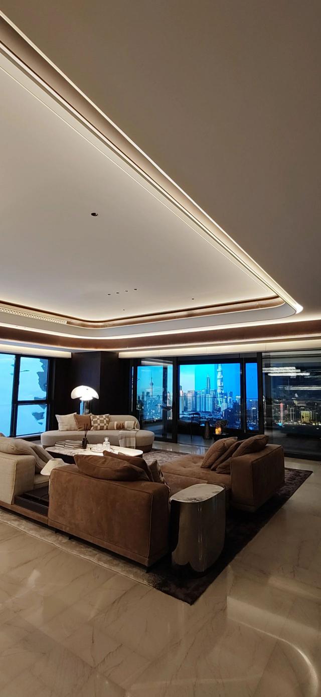 客厅更是 360 释放社交空间的美感,没有死角。在扩大空间的同时,天花板的设计也不是空的。