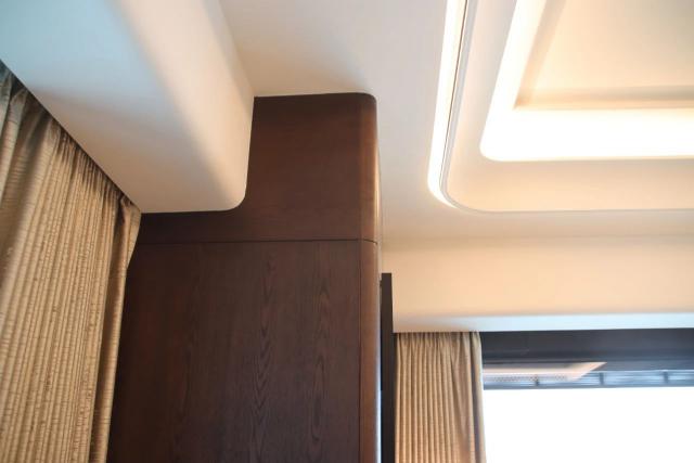天花板上的弧形打磨或梁柱的弧形打磨都非常严格,或者全皮革、全木饰面包裹都非常严格。