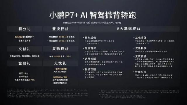 至 2025 年 1 月 31 日 24 点前支付 5000 元定金客户,除 8 除了大基本权益之外,整个车型也可以享受。 10000 小鹏商城积分,无上 5000 块的置换补贴,每年赠送 1500 度充电卡(6 年度)回购权利,低至 0 首付长至 5 年限时优惠金融计划,还有免费赠送天慕遮阳帘,簇绒脚垫,跟车, U 购买汽车的福利,如交付礼品。使用者可以通过小鹏汽车官方 APP、在全国范围内购买车辆的官网、小程序和销售点。