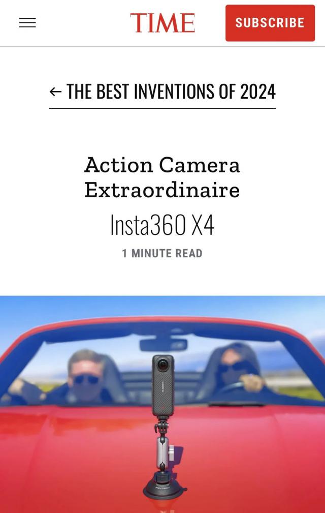 《时代》(TIME)杂志每年都会选出最具突破性的发明,堪称全球科技发明界的“奥斯卡”。近日,杂志评选出来。 2024 年最佳发明(THE BEST INVENTIONS OF 2024),影石 Insta360 8K 全景式运动相机 X4 成功入选。